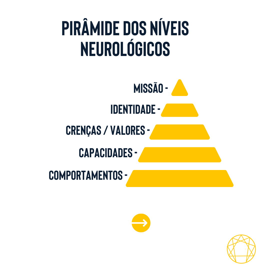 - Crenças/Valores: São a base sólida para o nosso crescimento, orientando as nossas decisões. Encontre os seus valores e não os quebre por ninguém.